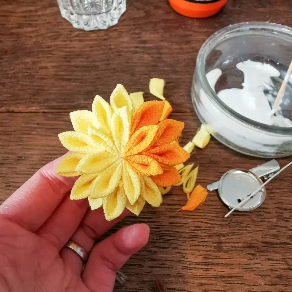 Réaliser une broche par tsumamizaiku, une méthode traditionnelle japonaise, qui plie des carrés de tissu formant des fleurs.