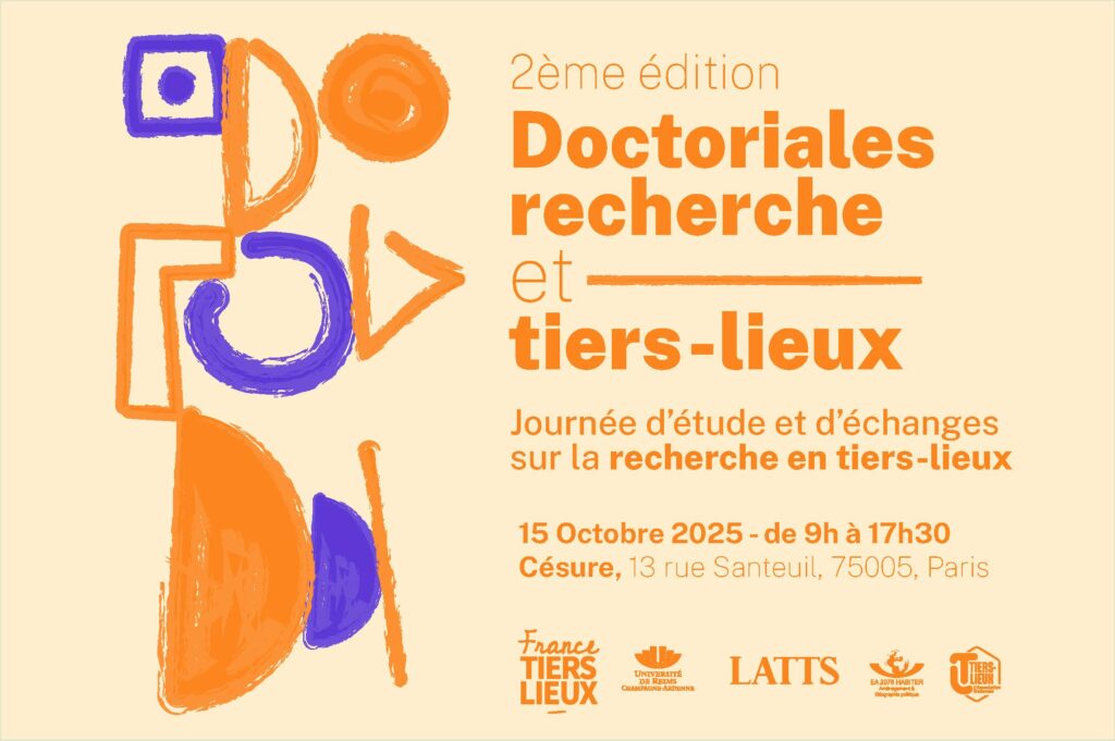 Le 15 octobre 2025, France Tiers-Lieux en partenariat avec Cécile Gauthier (Post-doctorante à Sciences Agro et Sciences Po Bordeaux), Fanny Cottet (Docteure en urbanisme, Université Paris 1 Panthéon-Sorbonne, Géographie-cités, Lab'Urba), Laure Michaud (doctorante, Université de Reims – EA 2076 Habiter) et les membres du GT Recherche de l’Association nationale des tiers-lieux, organisent la 2nde édition des Doctoriales, journée de rencontre et d’études sur et avec les tiers-lieux.