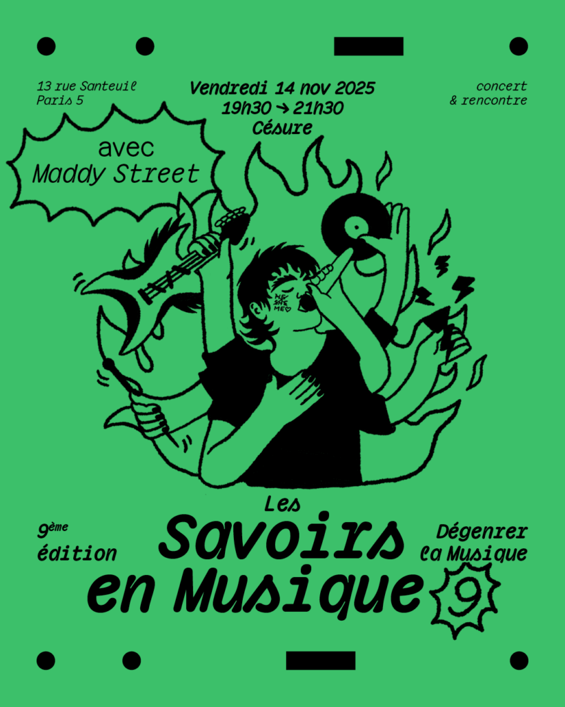 Pour cette neuvième édition, le journaliste et programmateur Paul Mougeot (Radio Moojo, Ground Control) rencontre Maddy Street pour une discussion autour de la notion de genre en milieu culturel, avant un concert acoustique inédit de l’artiste multi-facettes.