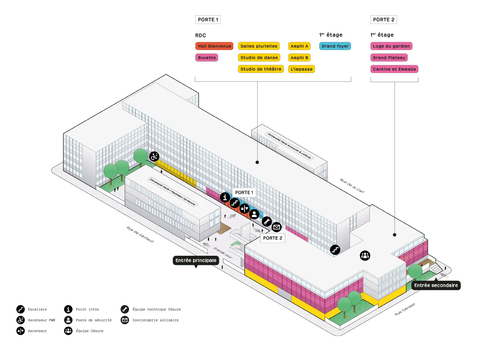 Des amphithéâtres, une Cantine conviviale et plusieurs salles de classe sont également disponibles à la privatisation. Que ce soit pour une conférence, une assemblée générale, un cocktail networking ou un tournage, Césure s’adapte à toutes vos exigences événementielles.